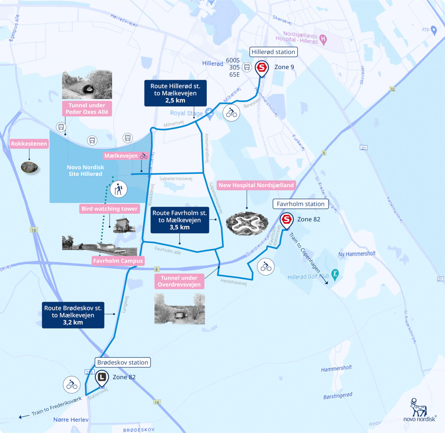 S-trains run every 10 minutes from Copenhagen Central Station to Favrholm Station near Novo Nordisk Site Hillerød. The journey takes 35 minutes. From Favrholm Station, you can cycle approximately 10 minutes to the site. If you choose to take the S-train to Hillerød Station, the journey takes 38 minutes, and there is an option to take a bus to the site.